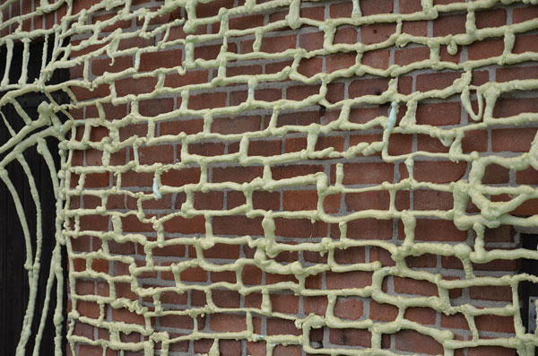 Met purfoam heb ik de bakstenen gevel van een vml. varkensschuur overgetekend en vervormd tot een romantisch en pittoresk beeld. Een beeld dat men eerder op het platteland zou verwachten dan de anoniem gebouwde varkenschuren.